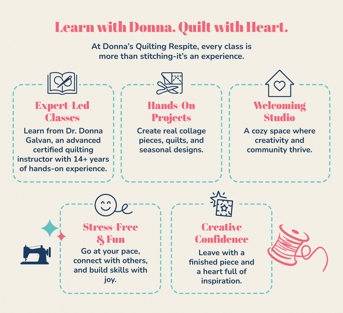 “Donna’s classes are my happy place. She has a way of making everyone feel welcome, whether it’s your first time threading a needle or your hundredth quilt. I’ve learned new techniques I never thought I’d master, and I always leave feeling inspired and relaxed.”