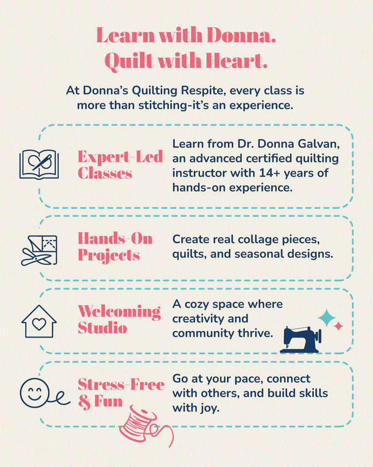 “Donna’s classes are my happy place. She has a way of making everyone feel welcome, whether it’s your first time threading a needle or your hundredth quilt. I’ve learned new techniques I never thought I’d master, and I always leave feeling inspired and relaxed.”