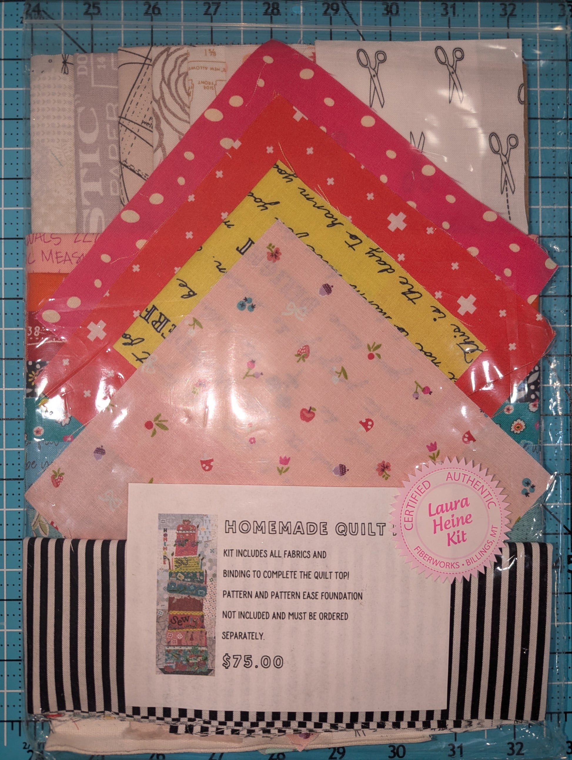 Homemade Collage Quilt Kit by Laura Heine. This kit includes all fabrics shown to complete the quilt top and binding. Size 16 1/2" x 45". Pattern and Pattern Ease Foundation not included. Sew On Pincushion is not included and is sold separately.
