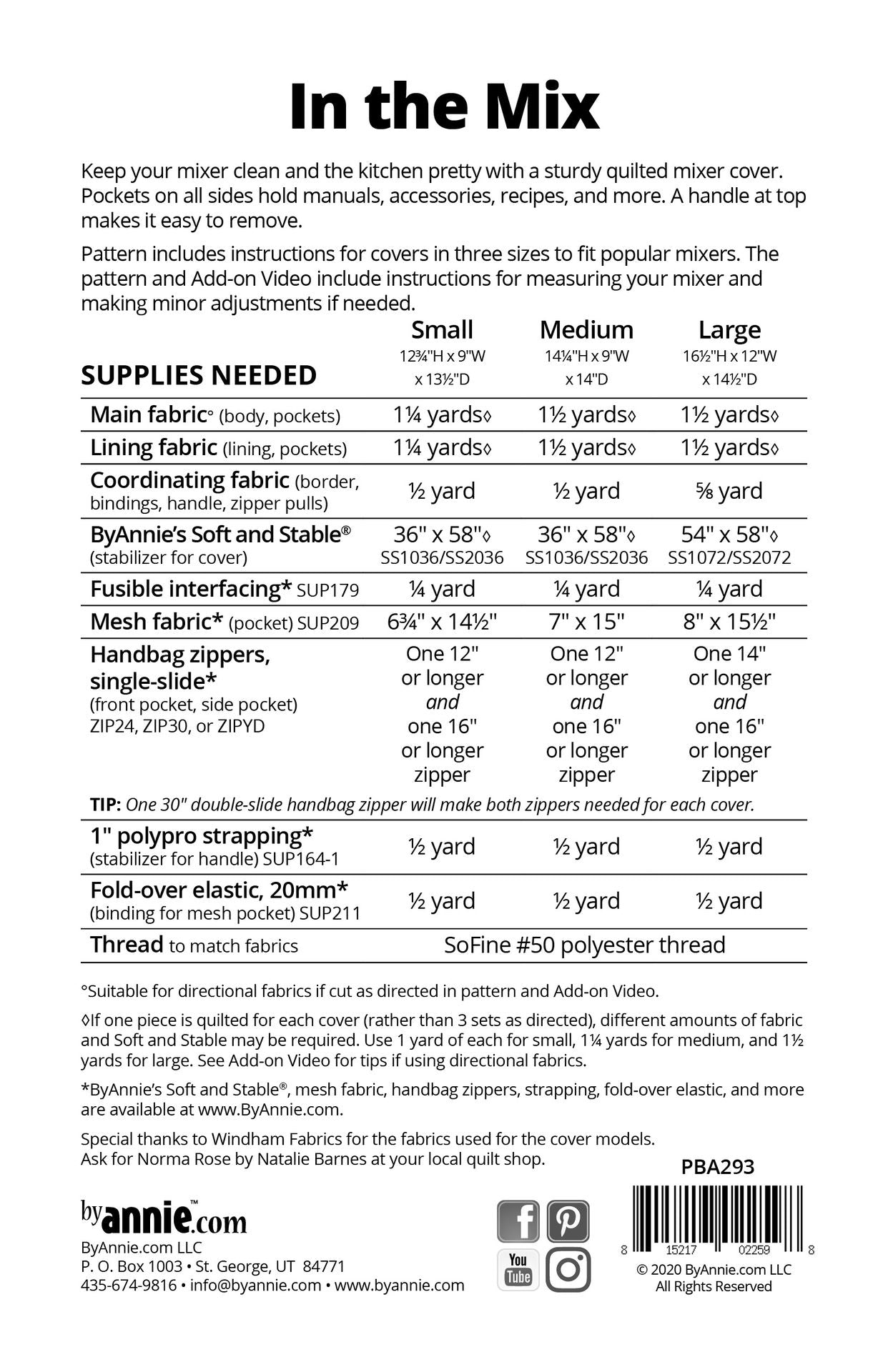 The pattern includes complete instructions for covers in three sizes to fit popular mixers. The pattern and Add-on Video include instructions for measuring your mixer and making adjustments if needed.