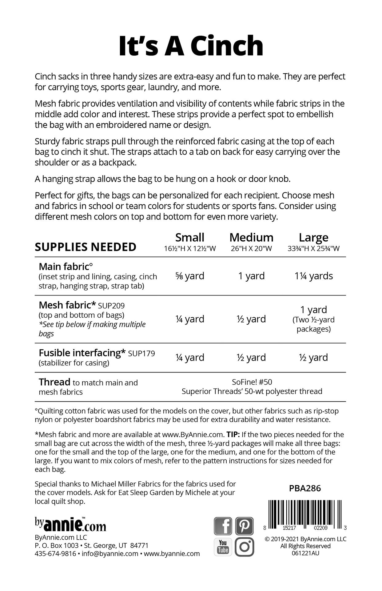 Cinch sacks in three handy sizes are extra-easy and fun to make. They are perfect for carrying toys, sports gear, laundry, and more.
