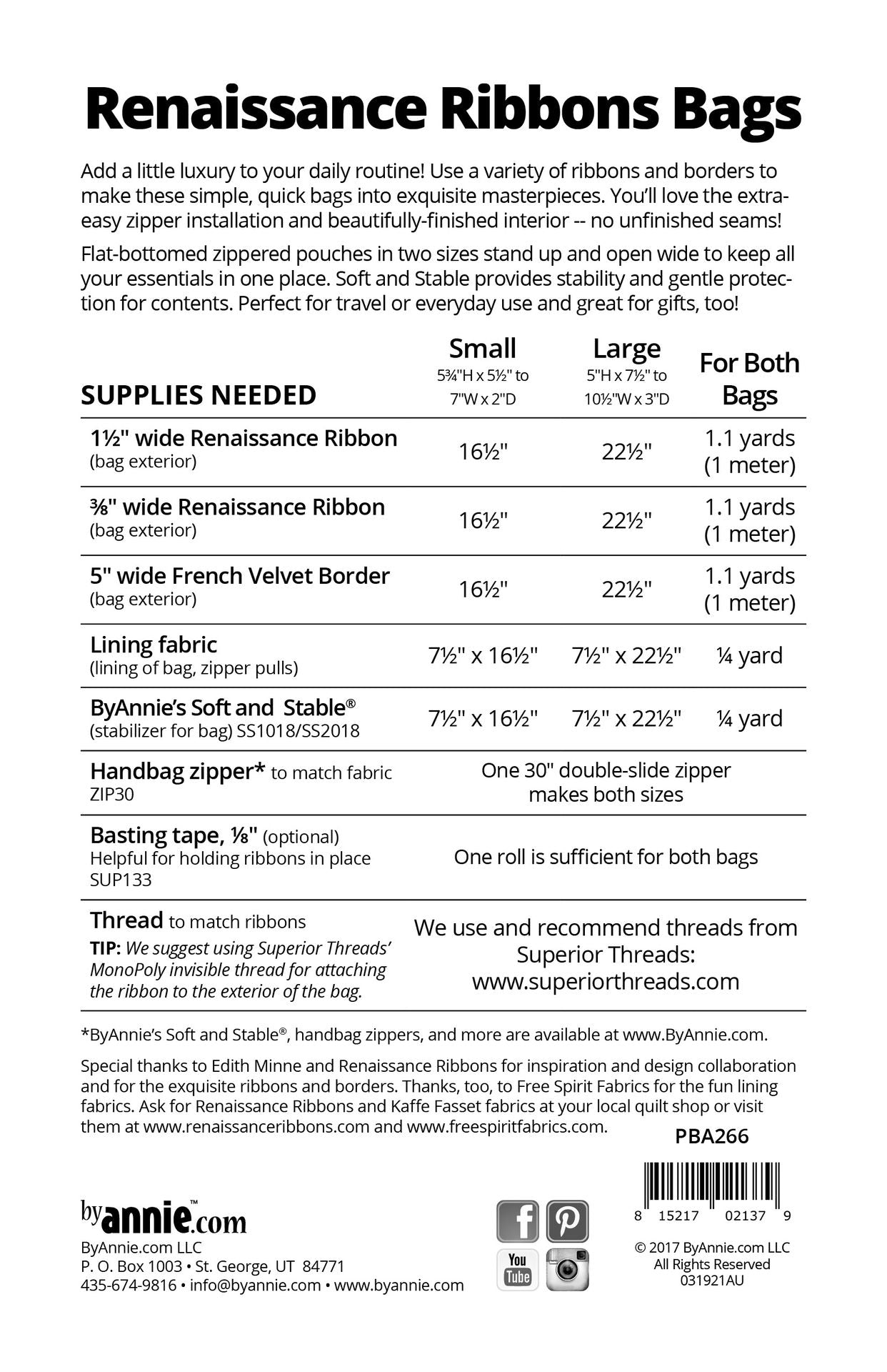Add a little luxury to your daily routine! Use a variety of ribbons and borders to make these simple, quick bags into exquisite masterpieces. Renaissance Ribbon Bags are perfect for travel or everyday use and great for gifts, too!