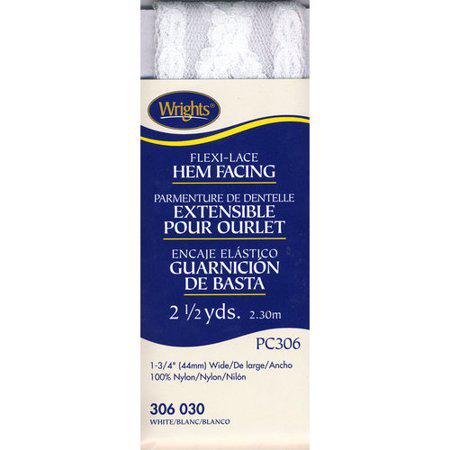 Wrights 1 3/4 Lace Hem Facing is a versatile product that can be used to finish hems for a seamless look or as a decorative trim. Made from 100% Nylon material, this lace tape is recommended for lightweight fabrics and is machine washable and colorfast. With a length of 3 yards and a width of 1 3/4 inches, this white lace hem facing is perfect for adding a touch of elegance to your sewing projects.